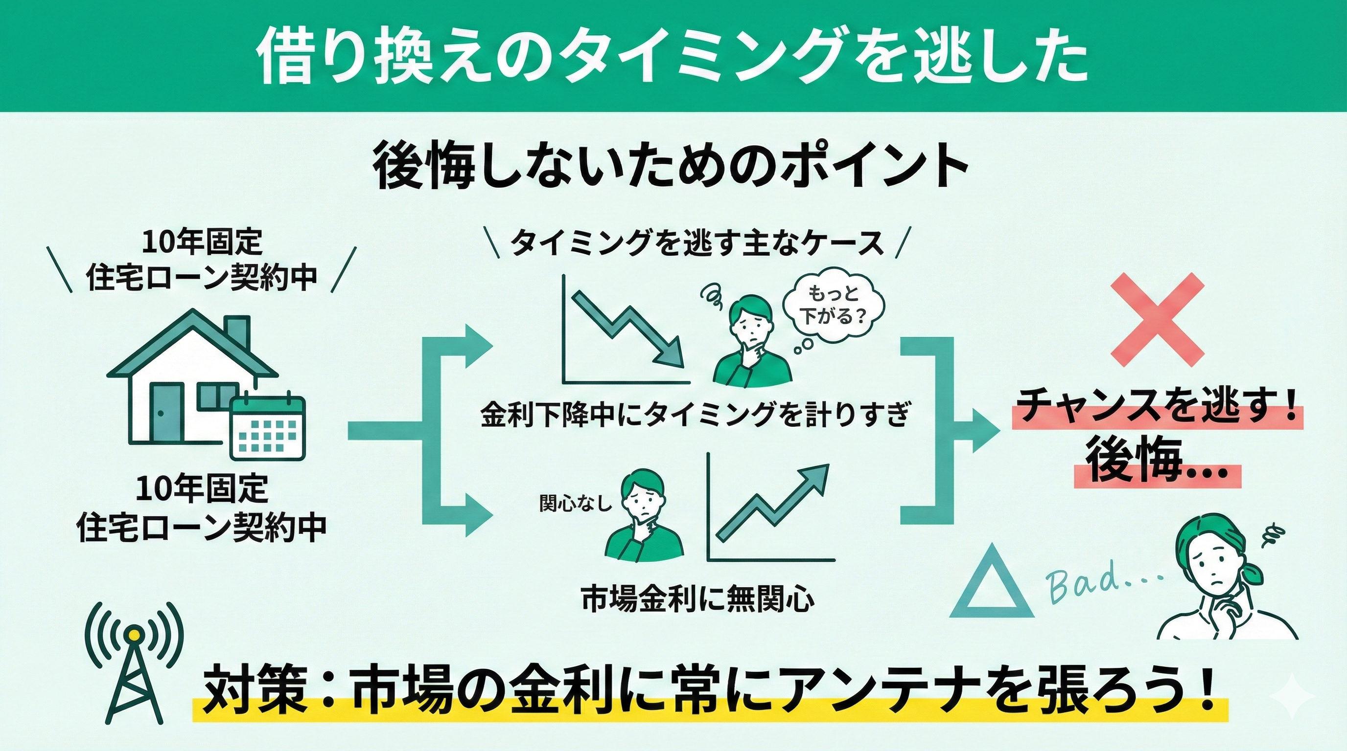 具体的には、金利が下降傾向でも「もっと下がるのではないか」とタイミングを計りすぎたケース、市場の金利に注目しておらずチャンスを逃してしまうケースが挙げられます。