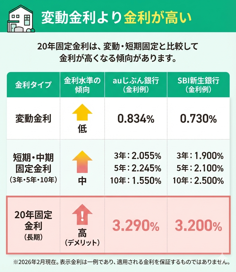 20年固定金利の住宅ローンのデメリットは、変動金利より金利が高いこと。