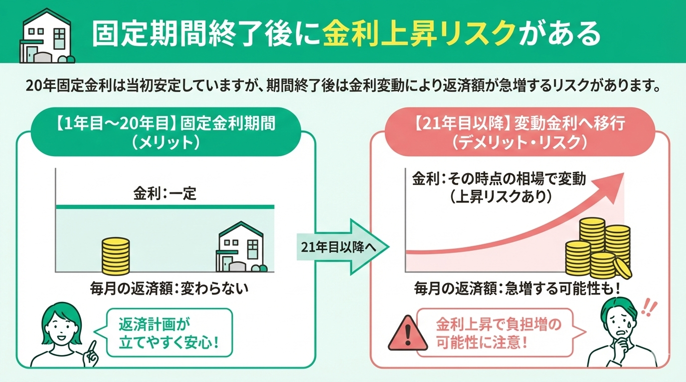 20年の固定金利は、返済額が確定する安心感がある一方で、変動金利より割高な金利設定や、完済前に訪れる21年目以降の金利上昇リスクには注意が必要です。