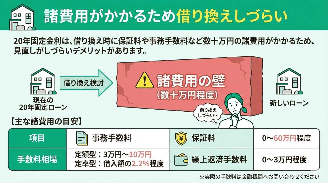 20年固定金利の住宅ローンのデメリットは、諸費用がかかるため借り換えがしづらいこと。