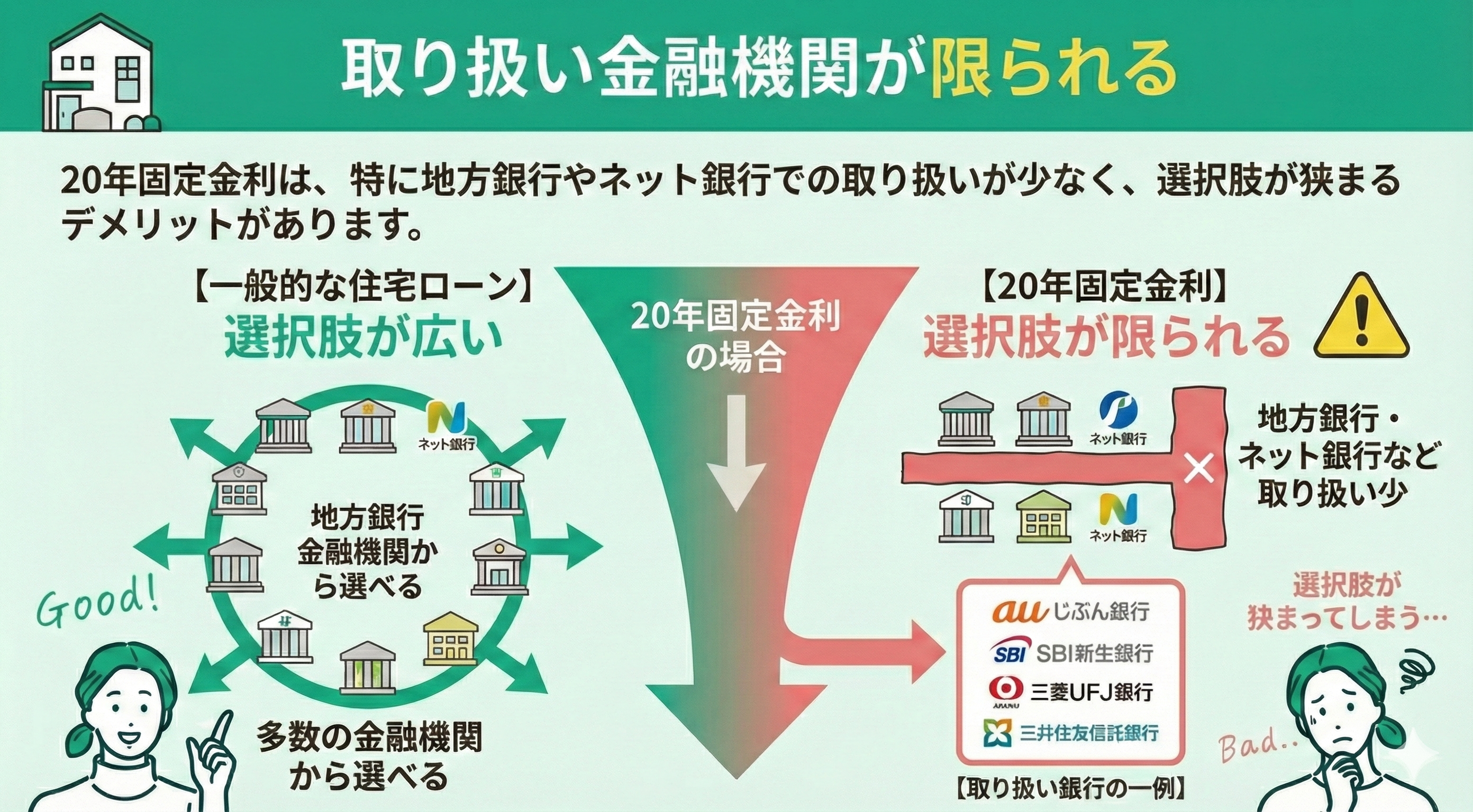取り扱い金融機関が限られることは、20年固定金利の住宅ローンのデメリットのひとつ。