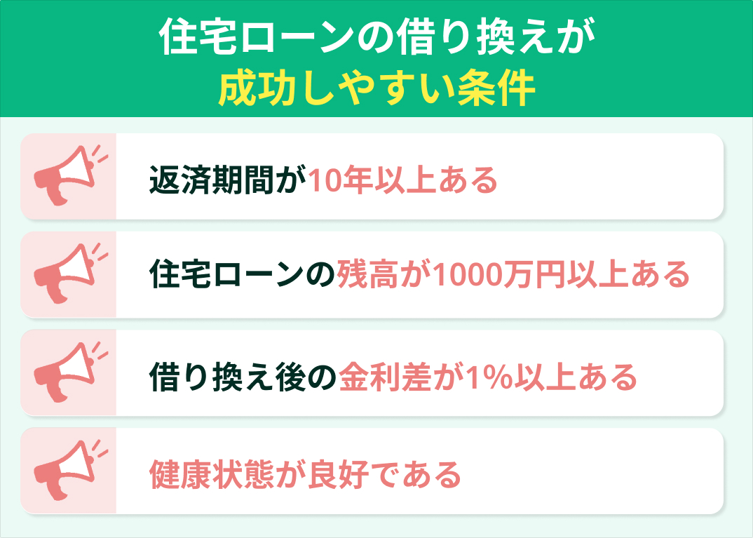 こちらでは、住宅ローンの借り換えを成功させやすい具体的な条件について解説していきます。