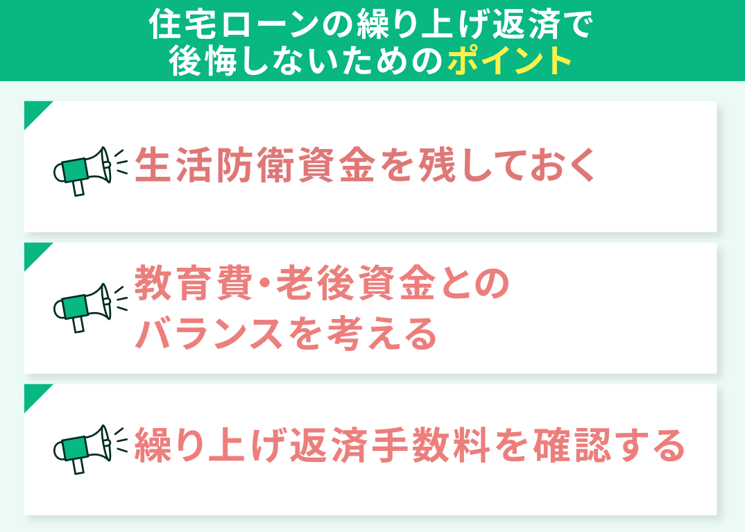 こちらでは、繰り上げ返済で後悔をしないための重要なポイント3つについて解説していきます。