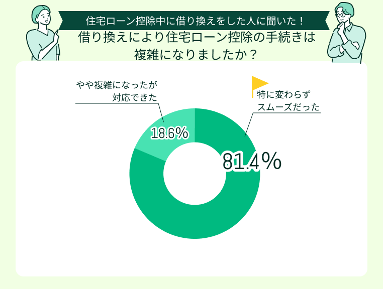 借り換えにより住宅ローン控除の手続きは複雑になったか、という質問に対し、81.4%の方は「特に変わらずスムーズだった」と回答しました。