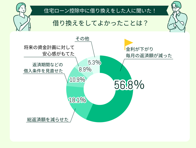 借り換えをしてよかったことで最も多かったのは「金利が下がり、毎月の返済額が減った」(56.8%)、次いで「総返済額を減らせた」(18.1%)でした。