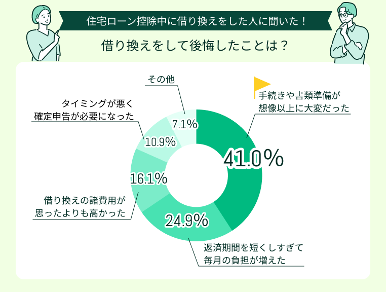 その他「返済期間を短くしすぎて毎月の負担が増えた」(24.9%)、「借り換えの諸費用が思ったよりも高かった」(16.1%)という声も目立ちました。