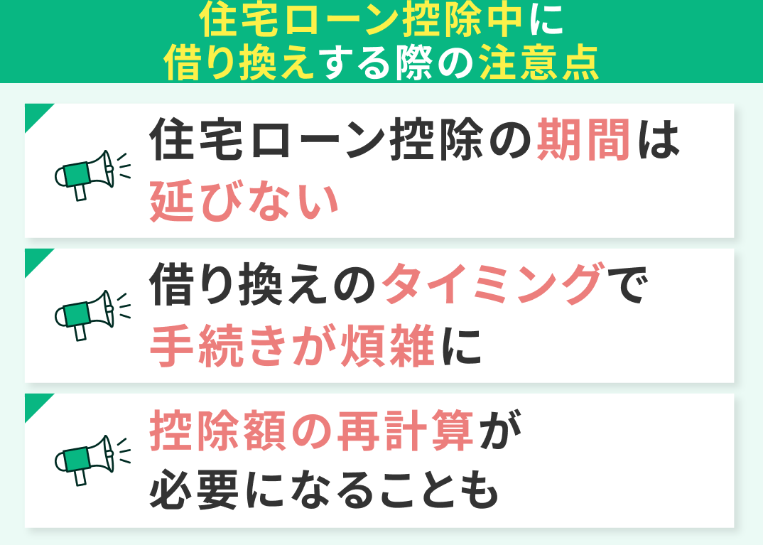 ただし、控除を引き続き利用する際は「借り換えで控除期間が伸びるわけではない」「新ローンの返済期間が10年未満になった、借入期間を別用途で使ってしまった場合は対象外となる」などの注意点も。