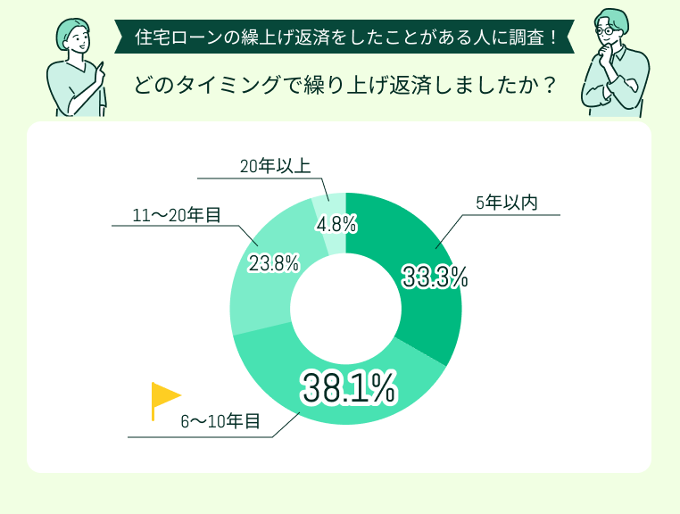 一方で、20年以上経ってから繰り上げ返済するケースは少数派です。返済が進むにつれて「利息削減効果が薄れる」「老後資金確保を優先する」などの理由で、積極的な繰り上げ返済は行われにくい傾向が見られます。