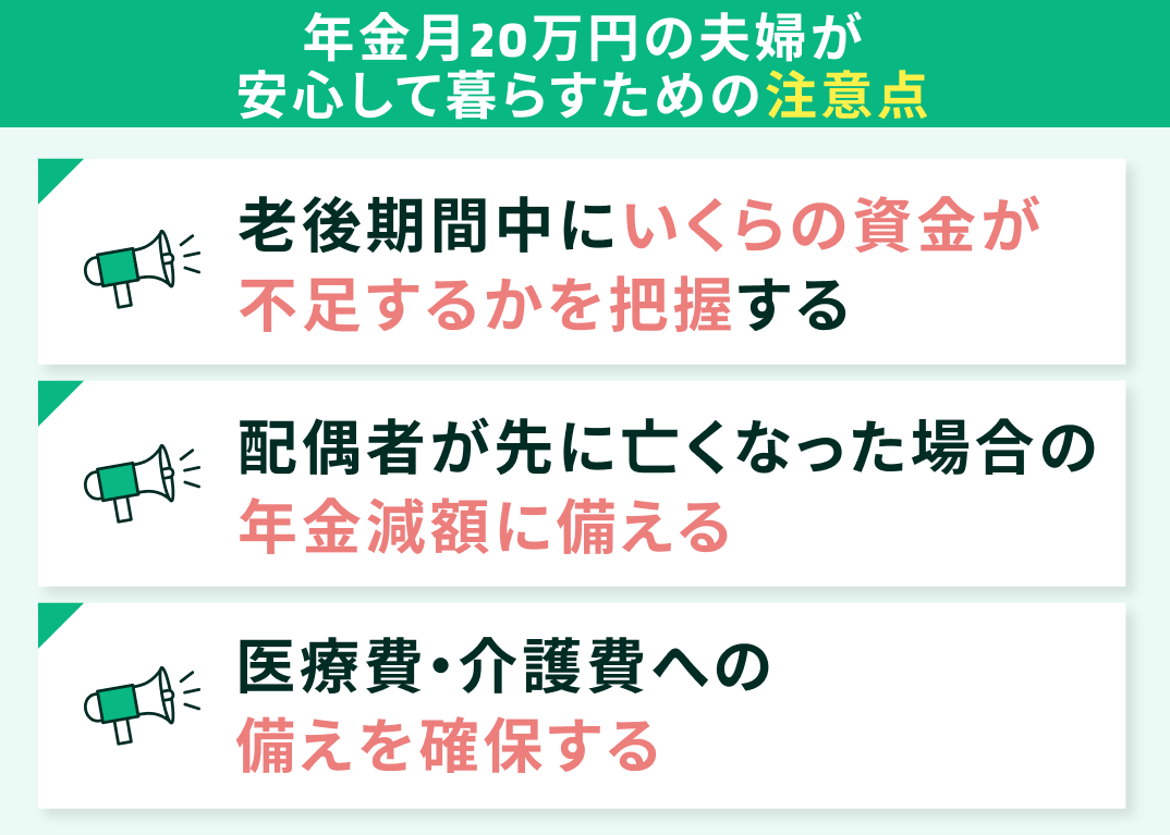 年金月20万円で暮らす場合、月々の収支管理だけでなく、将来起こりうるリスクにも備えましょう。老後に備えて、あらかじめ意識しておきたいポイントは以下のとおりです。