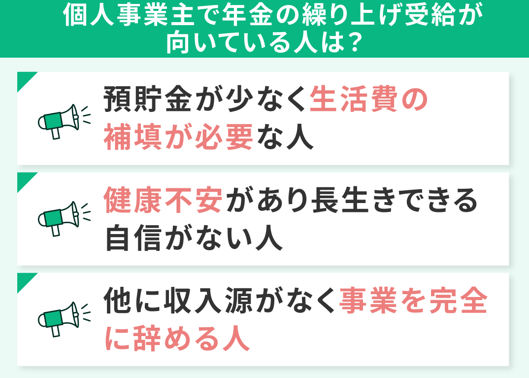 - 個人事業主で年金の繰り上げ受給が向いている人は?