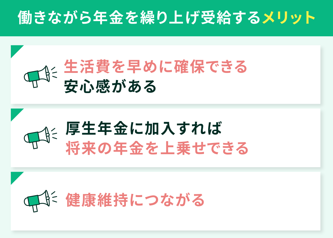 以下では、働きながら年金を繰り上げ受給する主なメリットを3つ紹介します。