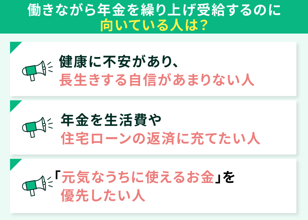 - 働きながら年金を繰り上げ受給するのに向いている人は?