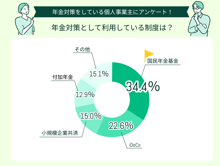 今回アンケートにご回答いただいた個人事業主の方のうち、34.4%が「国民年金基金」、22.6%が「iDeCo」を利用しているようです。