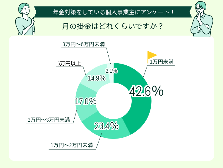 月の掛金で多かったのは「1万円未満」(42.6%)、「1万円~2万円未満」(23.4%)でした。