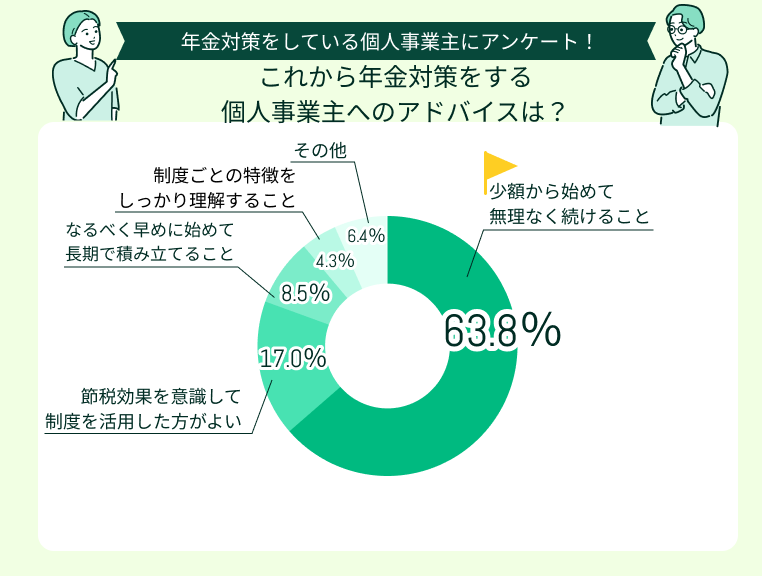 これから年金対策をする個人事業主にアドバイスで最も多かったのは「少額から始めて無理なく続けること」(63.8%)、次いで「節税効果を意識して制度を活用した方がよい」(17.0%)でした。