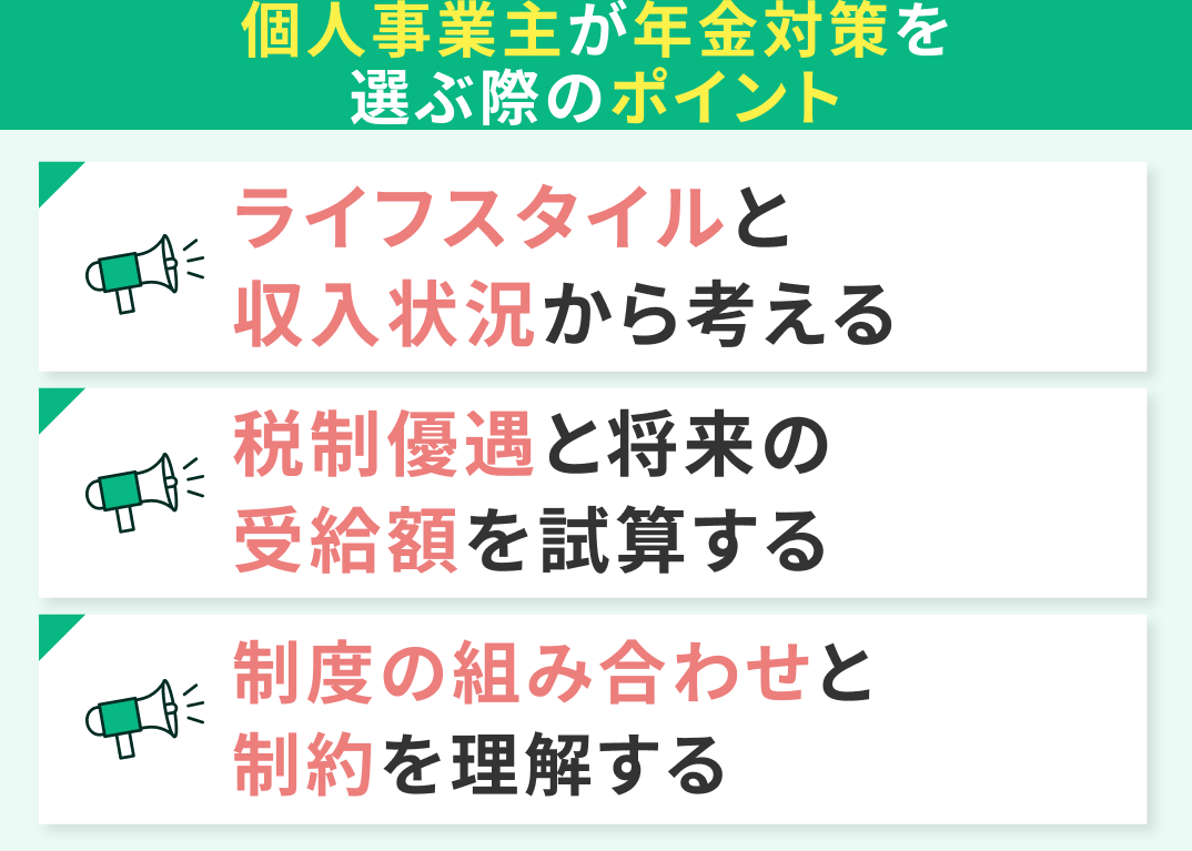 個人事業主が年金対策を選ぶ際は、ライフスタイルと収入状況から考えることが重要です。