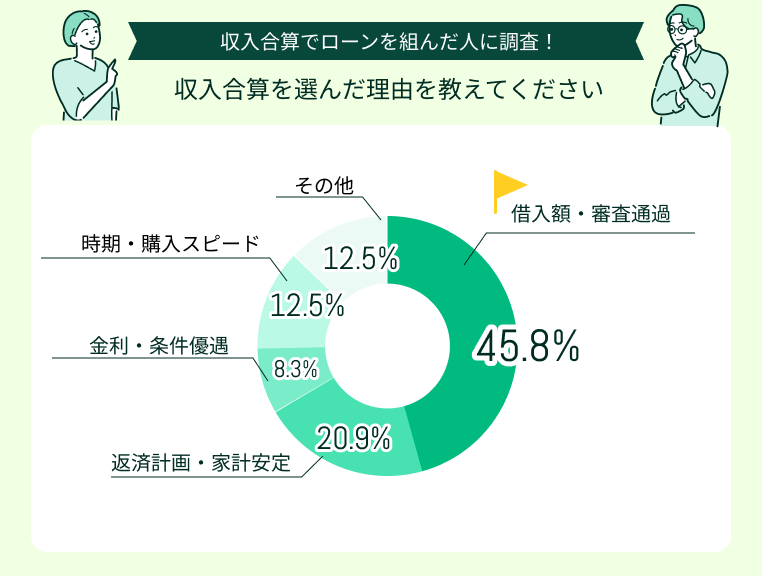配偶者の昇給が見込めませんでしたが、住宅購入のタイミングを早めたかったので、収入合算でローンを組みました。早めに家を持つことができて良かったと思っています。結婚後のキャリアプランや出産・育休の影響もシミュレーションしておくことをおすすめします。