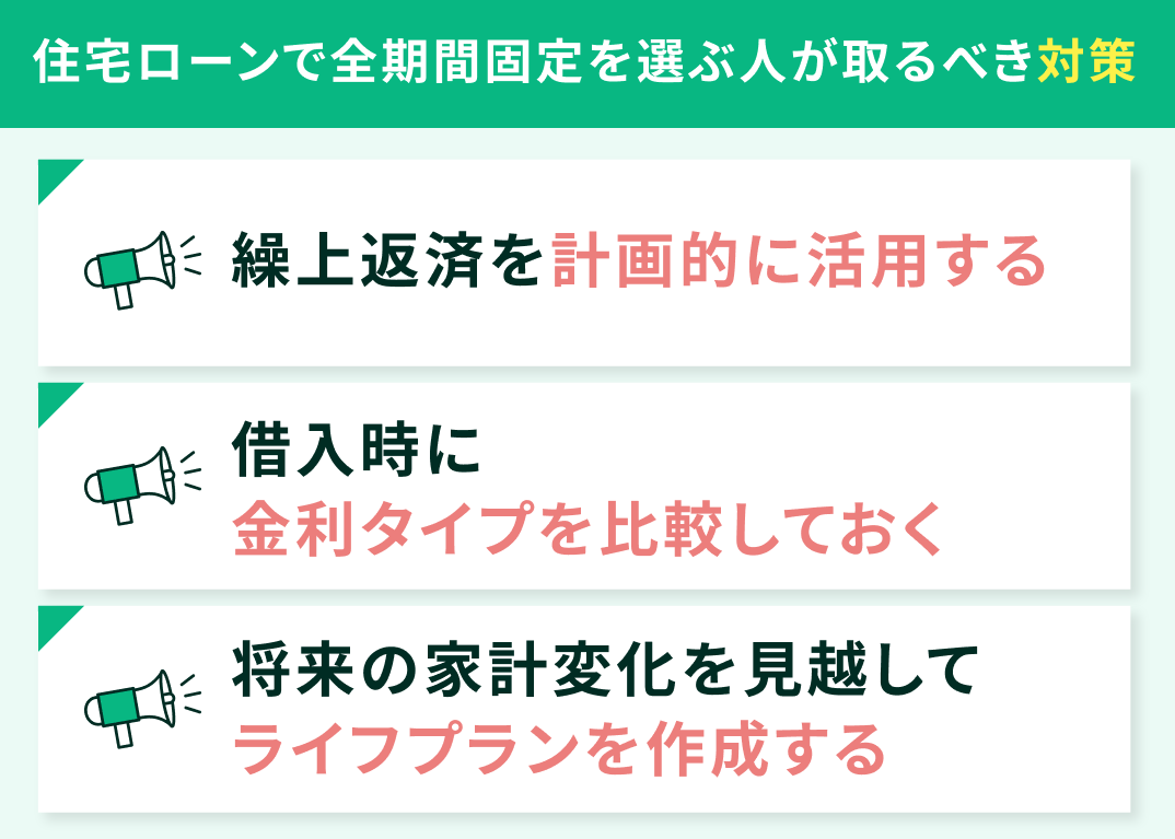 - 住宅ローンで全期間固定を選ぶ人が取るべき対策