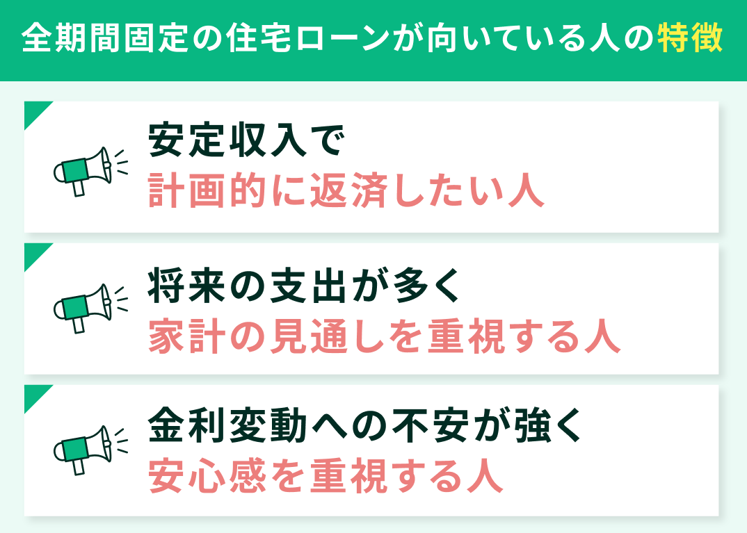 ここでは、そうした違いを踏まえながら、長期固定型のローンが向いている人の特徴を3つの視点から紹介します。