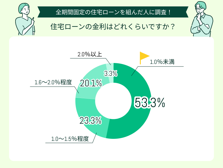 また「1.0〜1.5%程度」「1.6〜2.0%程度」の回答も合わせると、全体の9割以上が2%未満の低金利で借りている結果となりました。