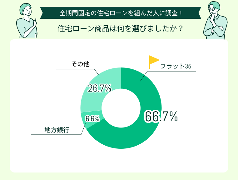この質問では、回答した人の約3人に2人が「フラット35」を選んでいることがわかりました。フラット35は、返済終了まで金利が変わらず、団信の選択肢や繰上返済のしやすさなど、安心感と柔軟性のバランスが取れた商品として支持されています。