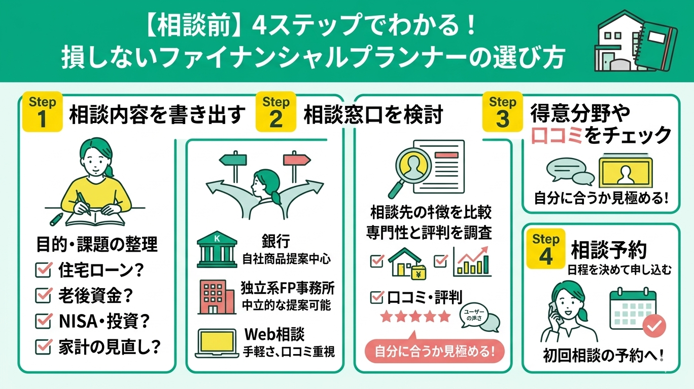 - 【相談前】4ステップでわかる!失敗しないファイナンシャルプランナーの選び方