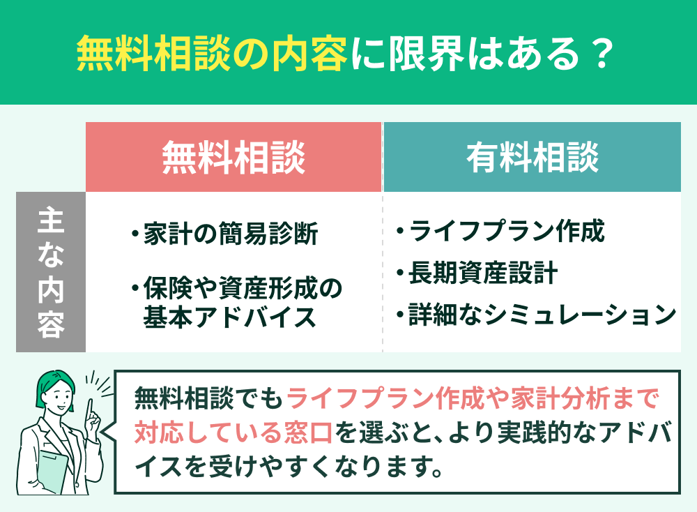 FP相談について「無料だと相談できる内容に限界があるのでは」と不安に感じる方もいます。実際、相談窓口によっては無料相談と有料相談を分けており、内容に差を設けているケースもあります。