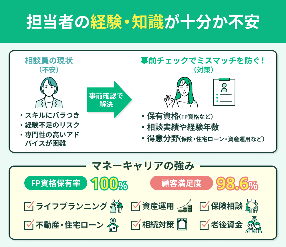 FP相談でよくある不安の一つが、「担当者の経験や知識は十分なのか」という点です。