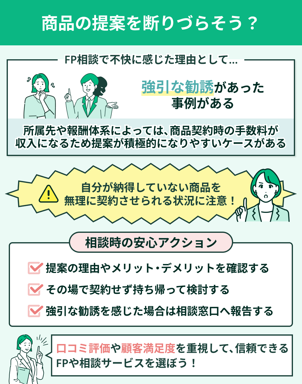 重要なのは、商品提案そのものではなく、自分が納得していない商品を無理に契約させられる状況です。