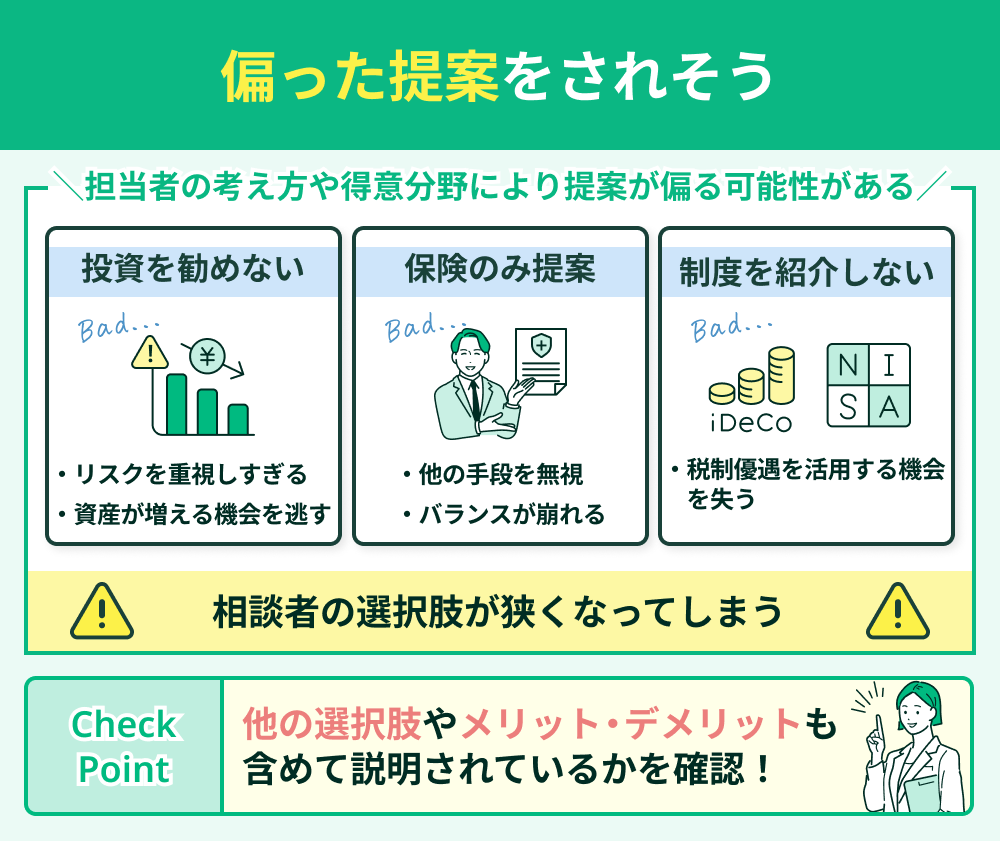 FP相談では、担当者の考え方や得意分野によって提案内容が偏る可能性があります。