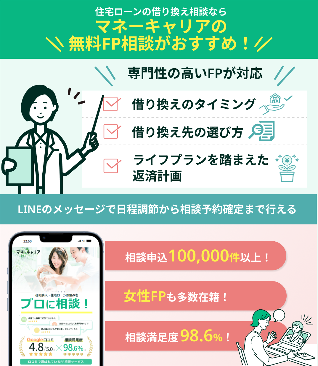 マネーキャリアなら、相談実績10万件・満足度98.6%の信頼できるFPが、あなたに合った借り換えプランを提案します。