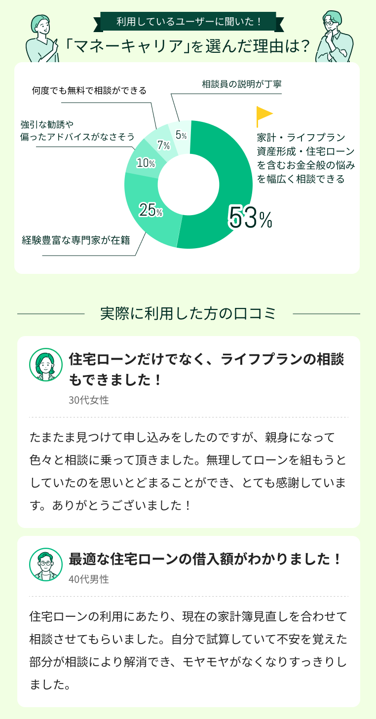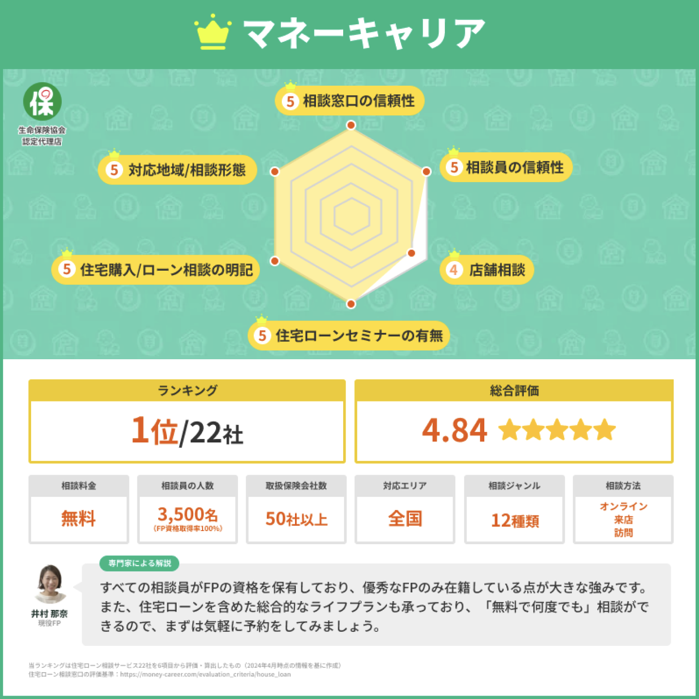 住宅ローンだけでなく、保険や資産形成などお金全般に精通したFPが多数在籍しており、相談内容に合った専門のFPが担当してくれます。