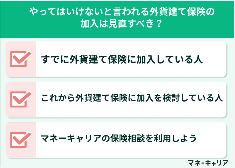 - やってはいけないと言われる外貨建て保険の加入は見直すべき?