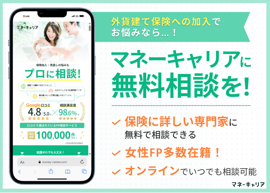 為替リスクが気になる場合でも、リスクを軽減・管理する目的で「貯蓄型保険」や「終身型保険」などがあるため、気になる方はマネーキャリアの『保険相談』にてこれらについても確認してみましょう。