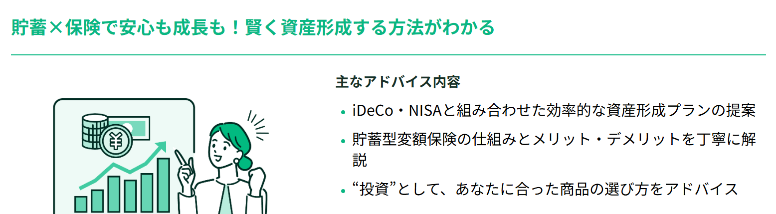 専門家(FP)が変額保険の適性を客観的に判断するだけでなく、保険と投資のバランスの最適化や生命保険料控除などの税制優遇を活用した資産形成のアドバイスが可能です。
