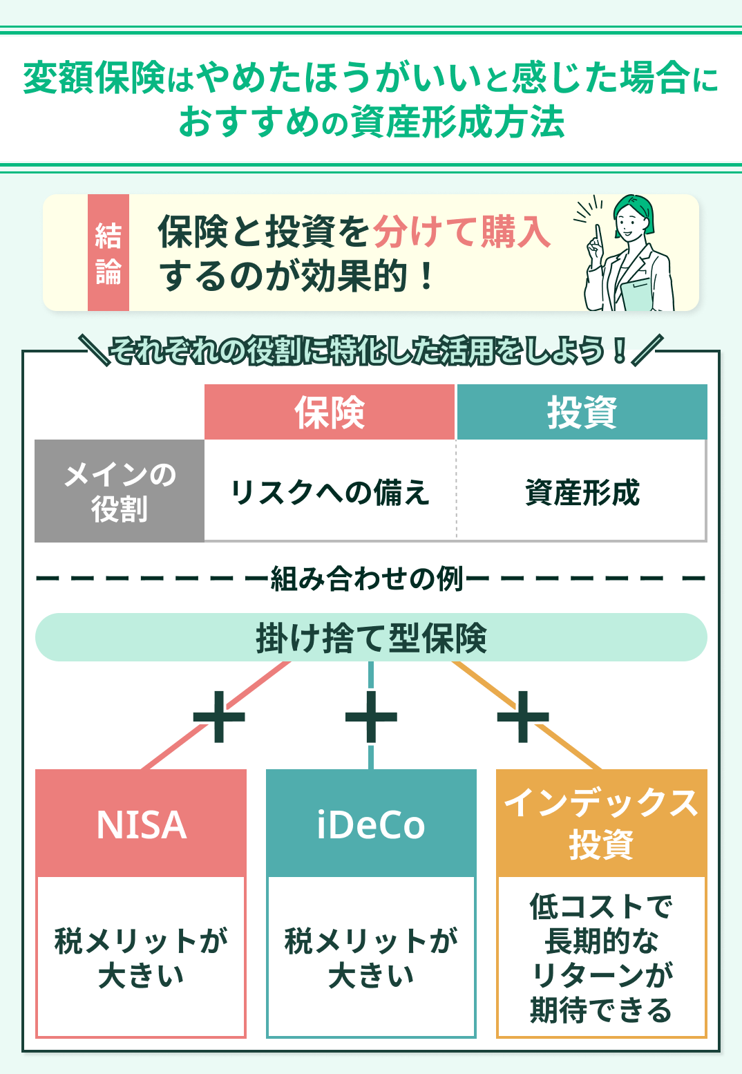資産形成を主に目的とする場合、変額保険以外の資産形成の選択肢として、「新NISA」「iDeCo」「インデックス投資」などもあります。