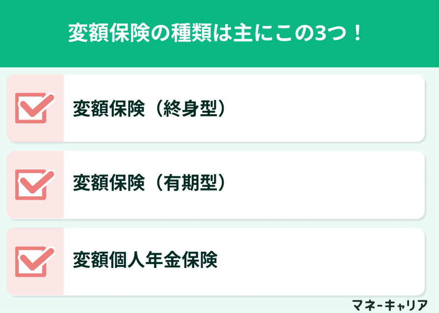 変額保険には主に「変額保険(終身型)、変額保険(有期型)、変額個人年金」の三種類があります。同じ変額保険と言っても、元本割れのリスクが異なります。