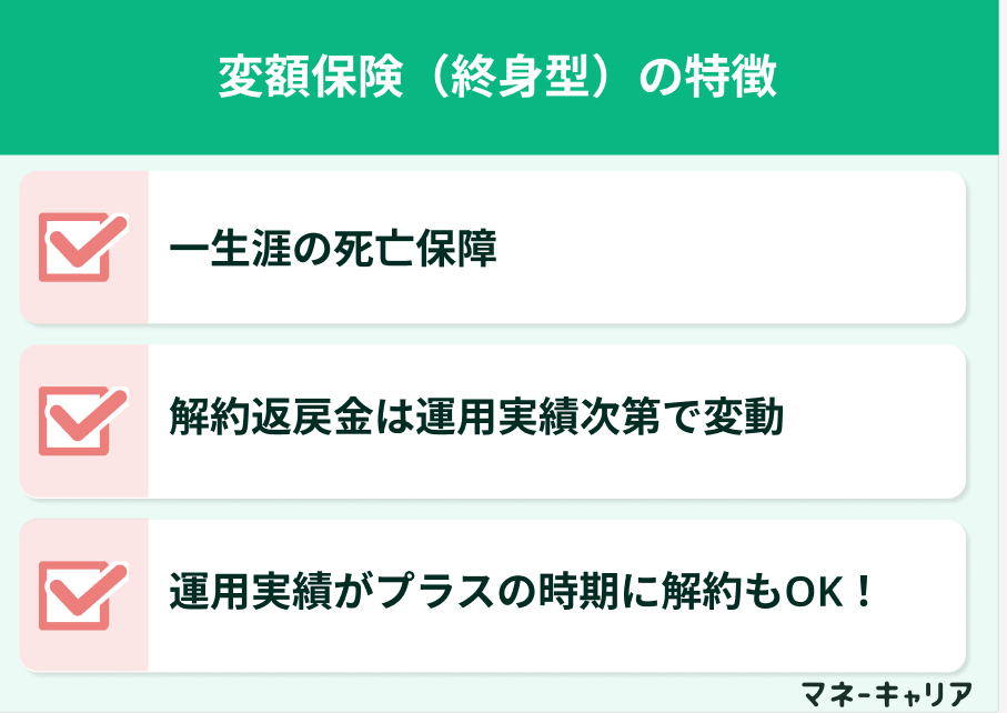 変額終身保険は、一生涯の死亡保障が続く商品です。死亡保険金には基本保険金額という最低保証がありますが、解約返戻金には最低保証がなく運用実績次第で変動します。運用がプラスになれば、死亡保険金と解約返戻金の両方が増加します。