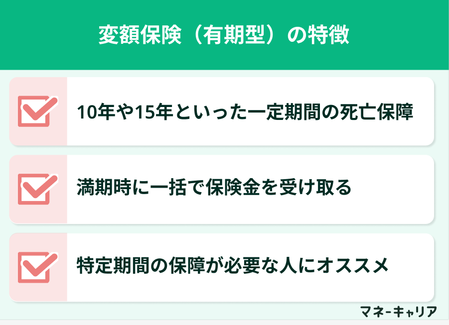 変額有期保険は、10年や15年といった一定期間の死亡保障を提供する商品で、満期保険金があるのが特徴です。死亡保険金には基本保険金額の保証がありますが、満期保険金には最低保証がない場合が多くなっています。