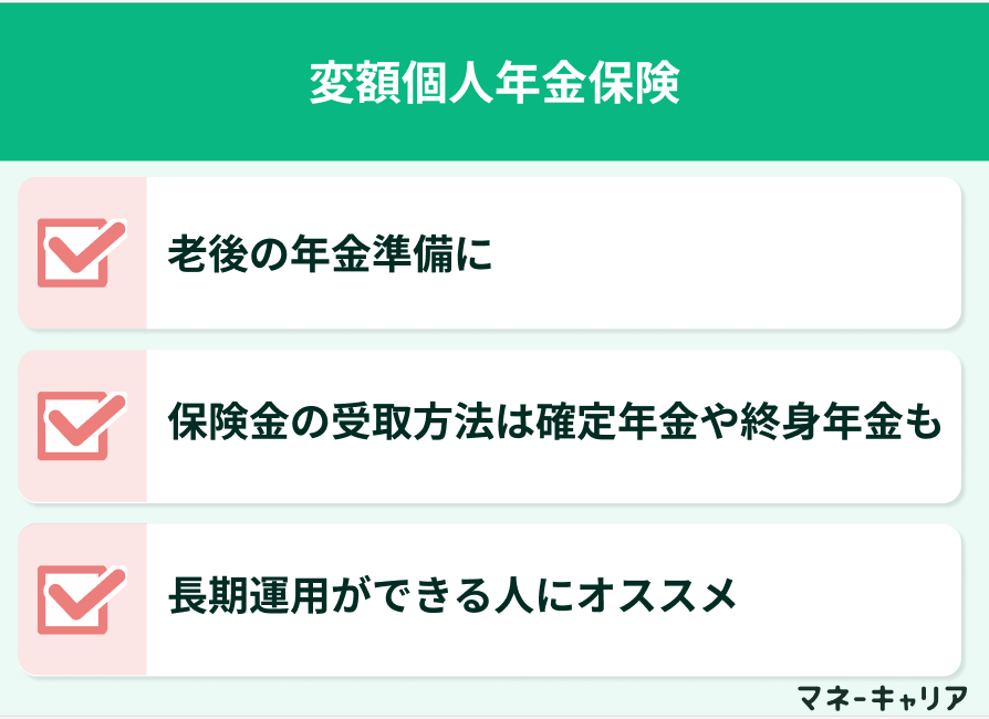 変額個人年金保険は、老後の年金準備を目的とした商品です。運用期間中は死亡保障もあり、年金受取開始時の原資が運用実績によって変動します。受取方法は一時金のほか、確定年金や終身年金などから選択できます。