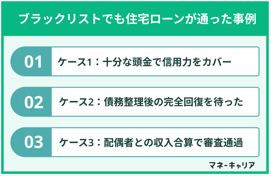 ブラックリストに載っていても、個人の信用力を高めたことで住宅ローンに通ったケースがあります。