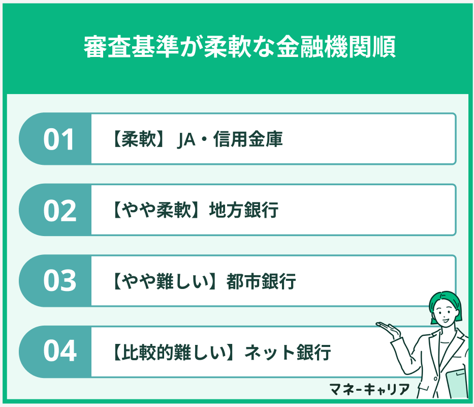 特に信用金庫やJAなどの非営利金融機関は、民間銀行と比べて柔軟に対応してくれるケースがあります。ただし、短期間に多数の審査履歴が残ると「申込みブラック」となり通りにくくなるため、複数の審査を同時に行うことには注意しましょう。