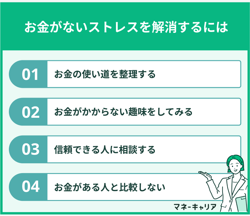 お金がないストレスを解消する方法は、まず、お金の使い道を整理することから始めます。