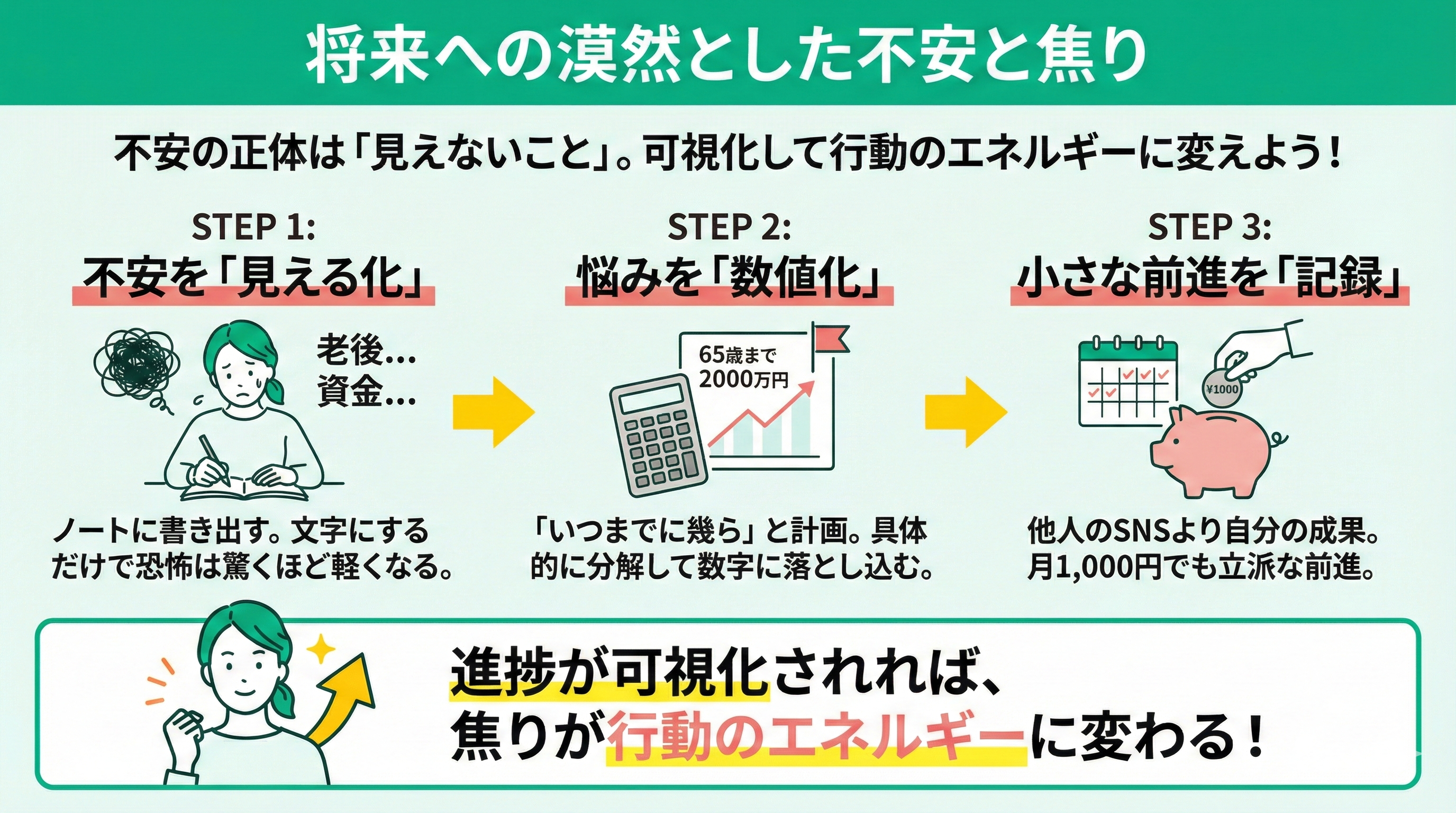 でも、その不安の正体は「見えないこと」にあります。まずはノートに不安を書き出すことから始めてみてください。文字にして「見える化」するだけで、漠然とした恐怖は驚くほど軽くなりますよ。