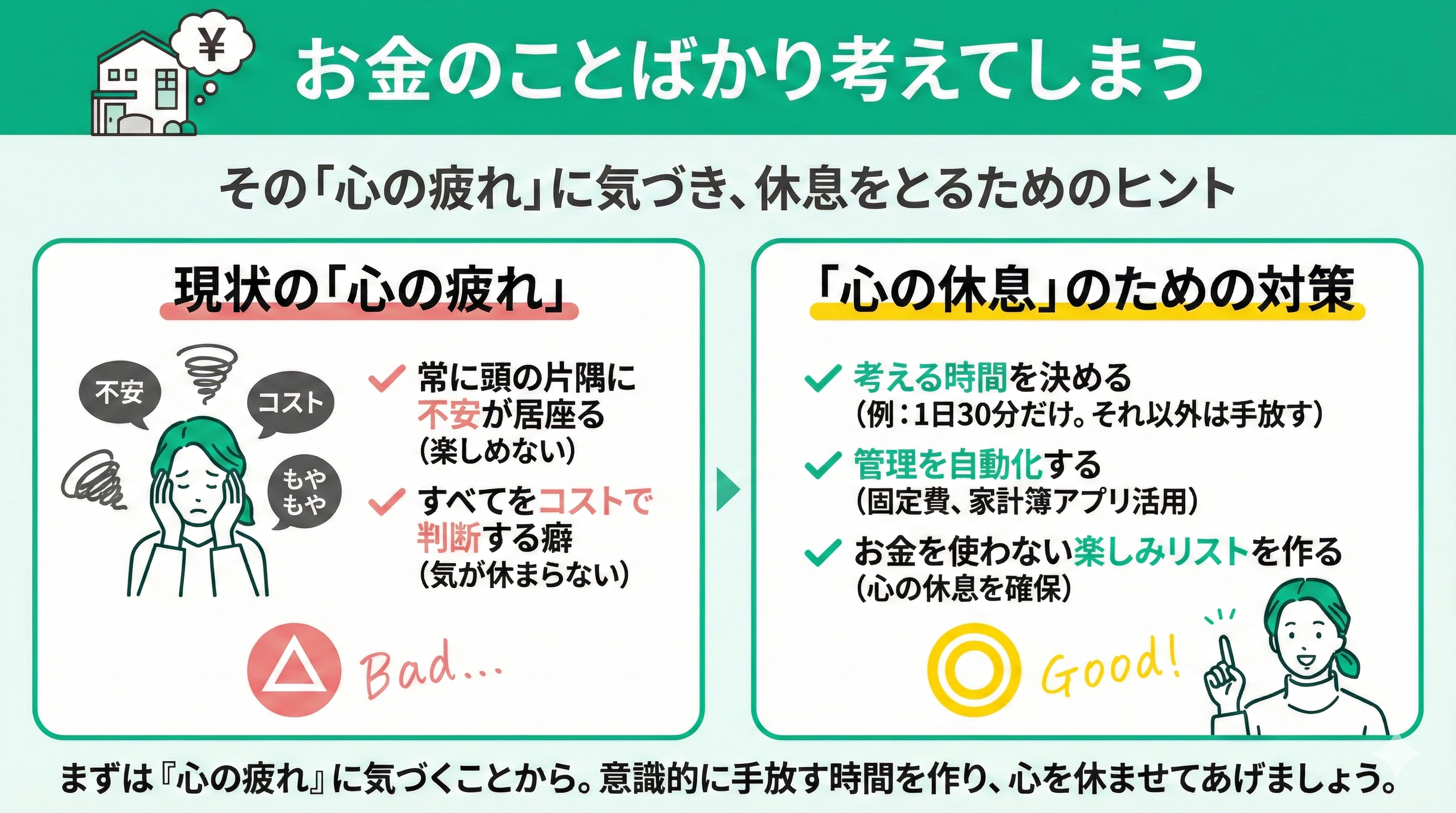 お金に余裕がない時期は、ついそのことばかり考えてしまいがちですよね。友人との会話や仕事中、何をしていても頭の片隅に不安が居座り、心から楽しめないこともあるでしょう。