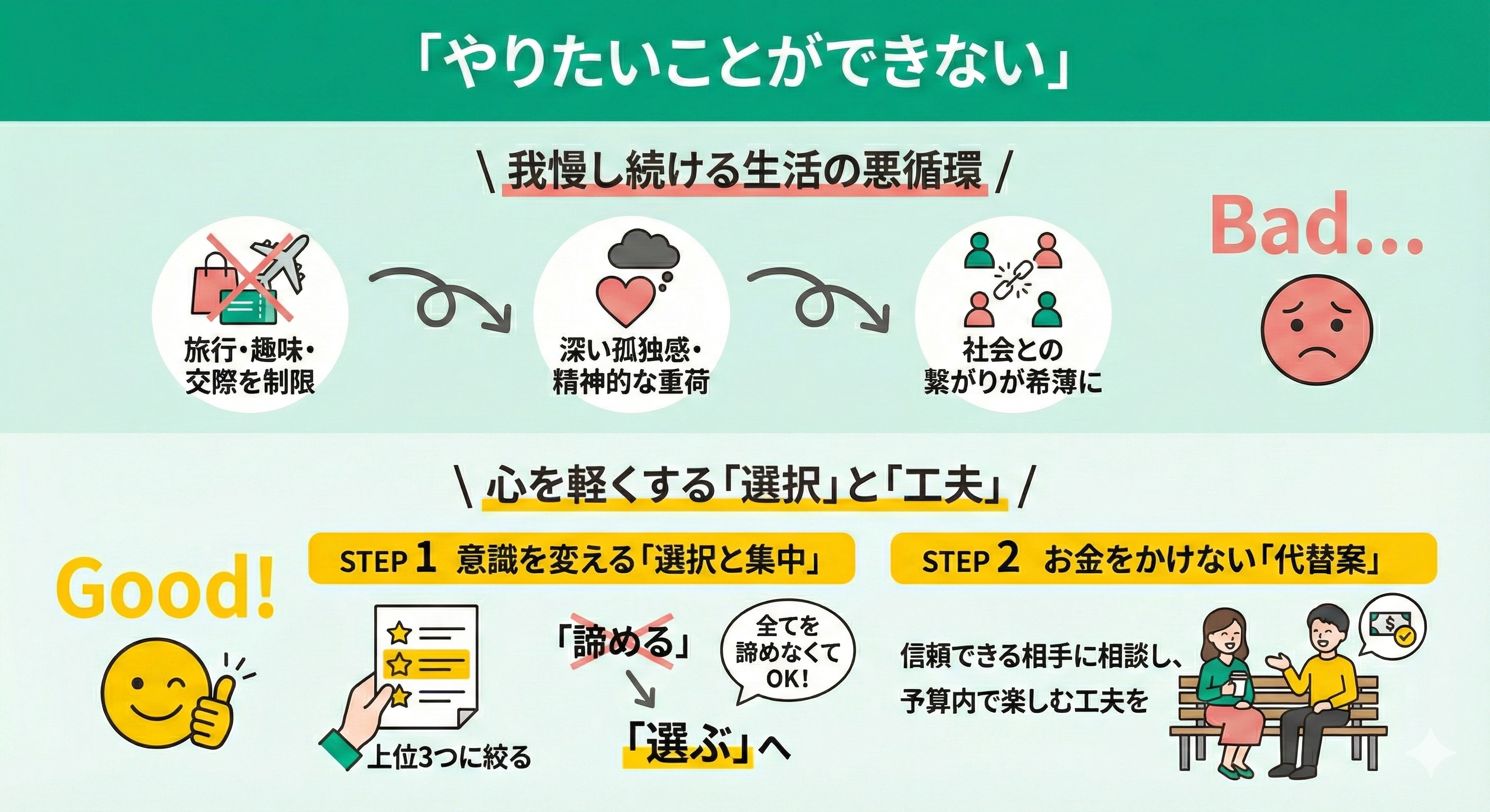 単発の我慢なら耐えられても、出口が見えない節約生活は精神的な大きな負担となります。「お金がないから」と祝い事や友人の誘いを断り続けることで、社会との繋がりまで希薄になってしまう不安は、とても切実な悩みです。
