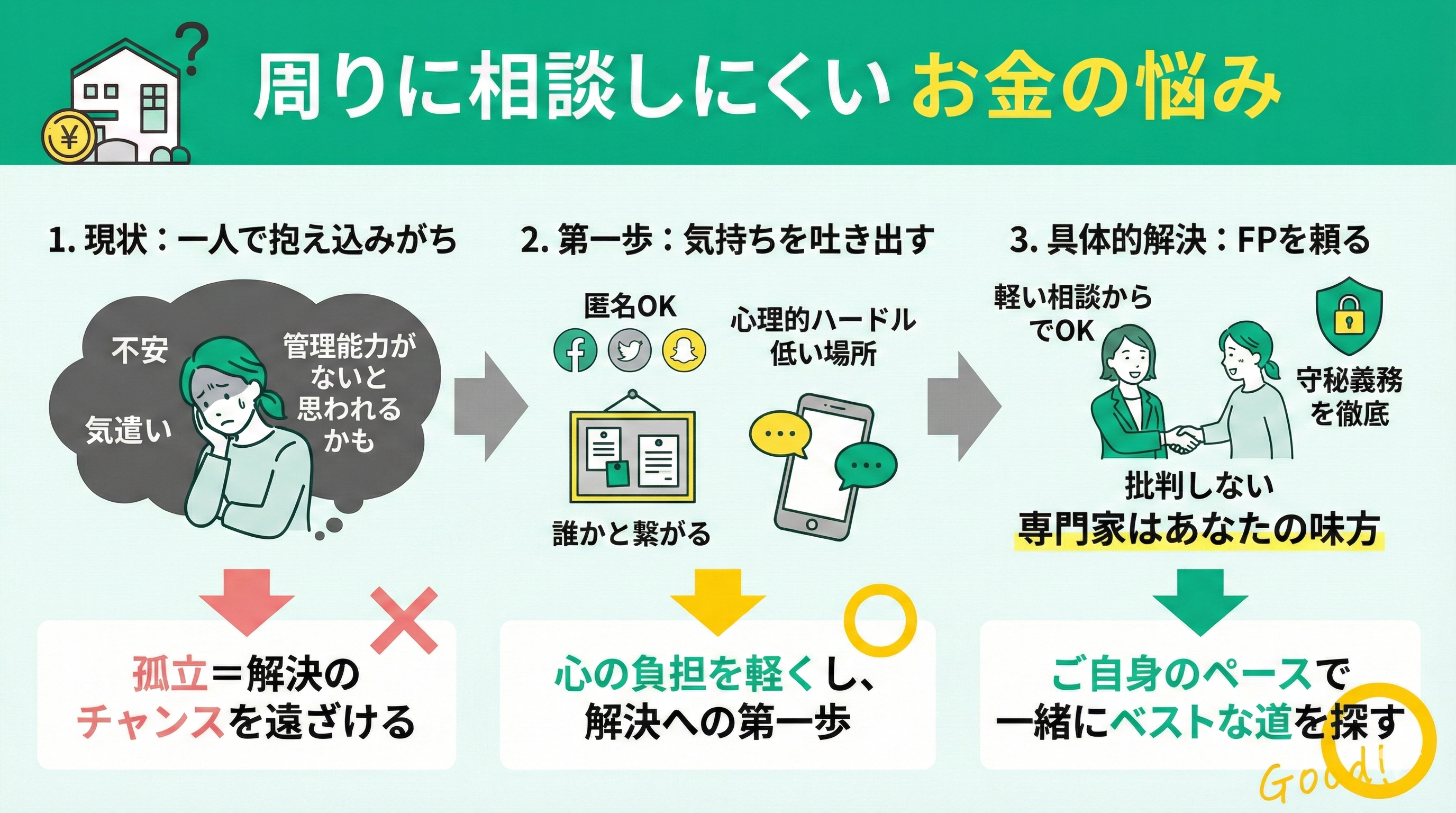 お金の悩みは「管理能力がないと思われるかも」という不安や、相手への気遣いから、つい一人で抱え込みがちですよね。しかし、その孤立こそが解決のチャンスを遠ざけてしまいます。