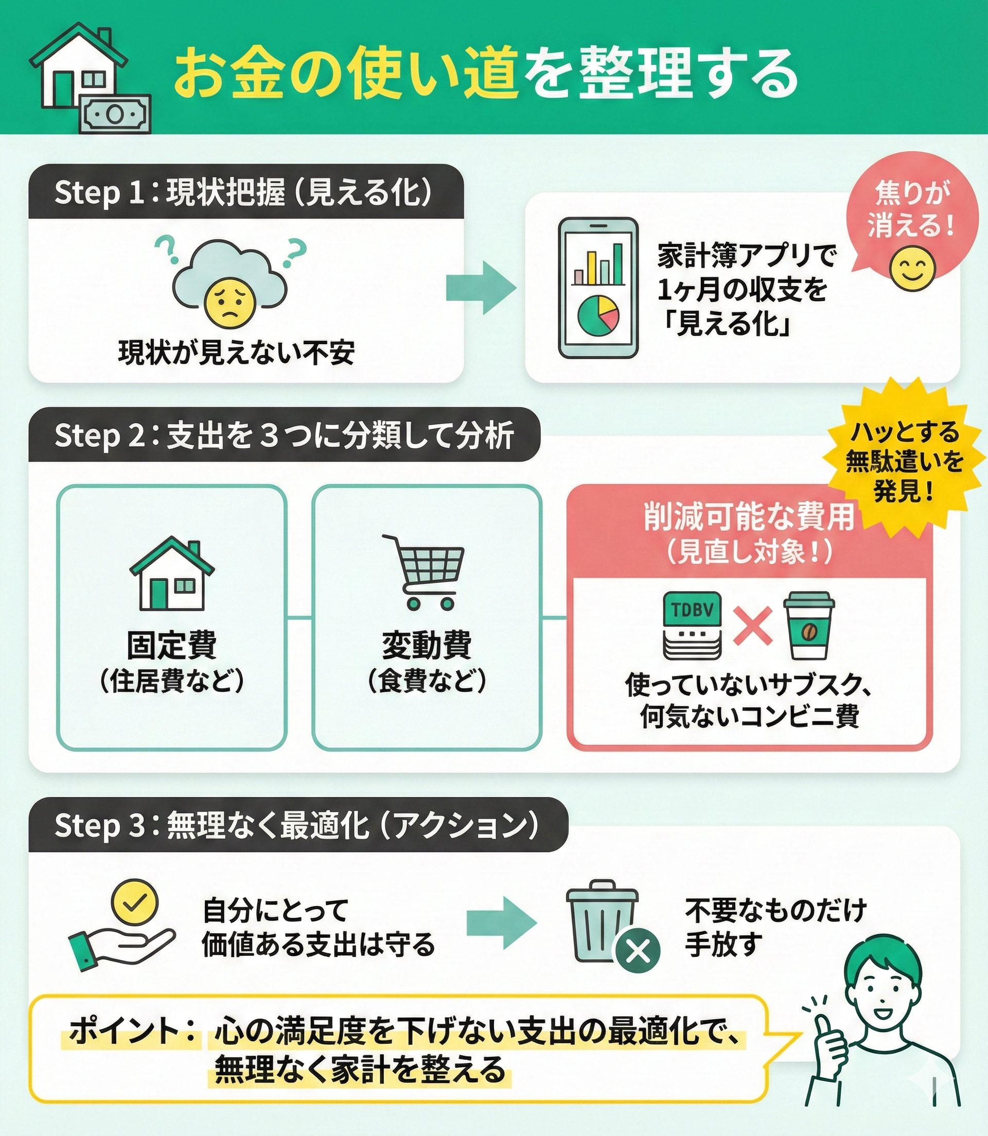 支出を固定費・変動費・削減可能な費用の3つに分けると、意外な無駄遣いにハッとするはず。現状を正しく把握するだけでも、漠然とした焦りはすっと消えていきますよ。