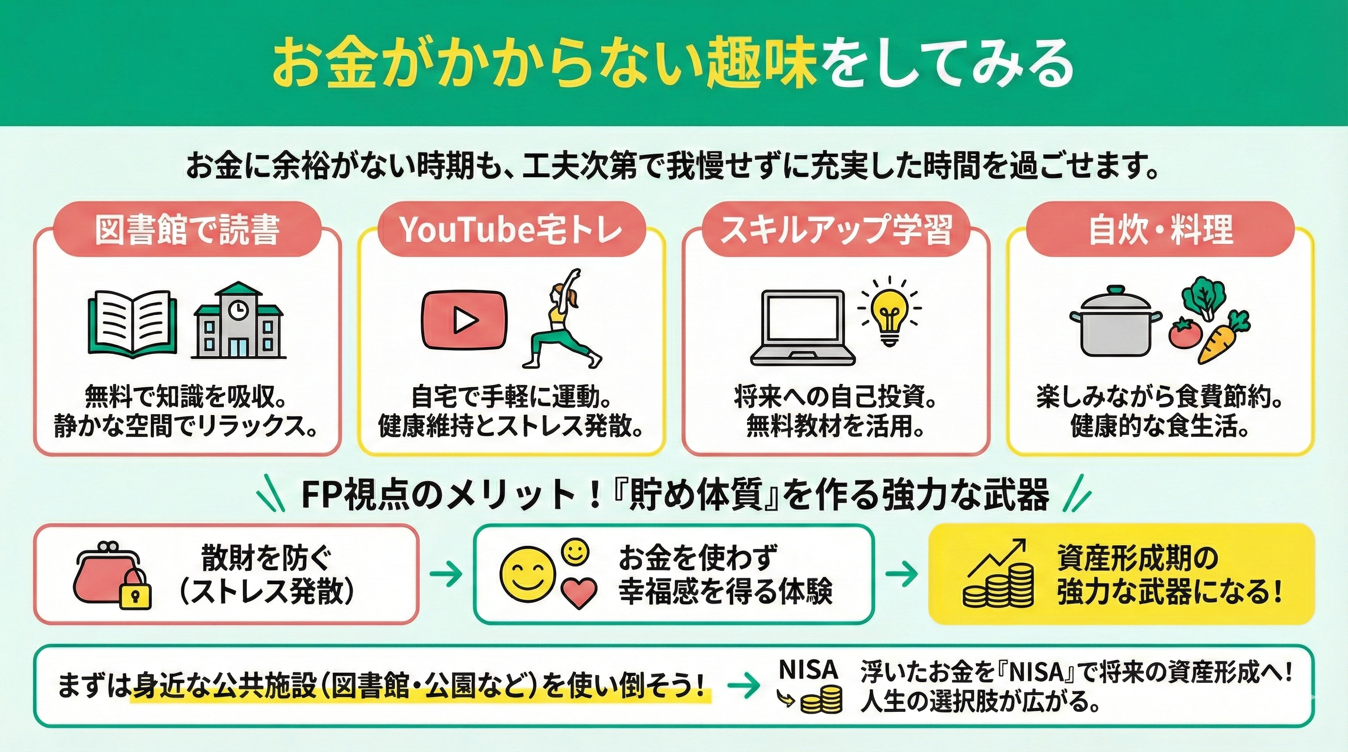 図書館での読書やYouTubeを活用した宅トレ、スキルアップ学習など、生活の質を落とさず支出を抑える方法は意外と多いもの。特に自炊などの料理は、楽しみながら食費の節約にもなる一石二鳥の趣味です。