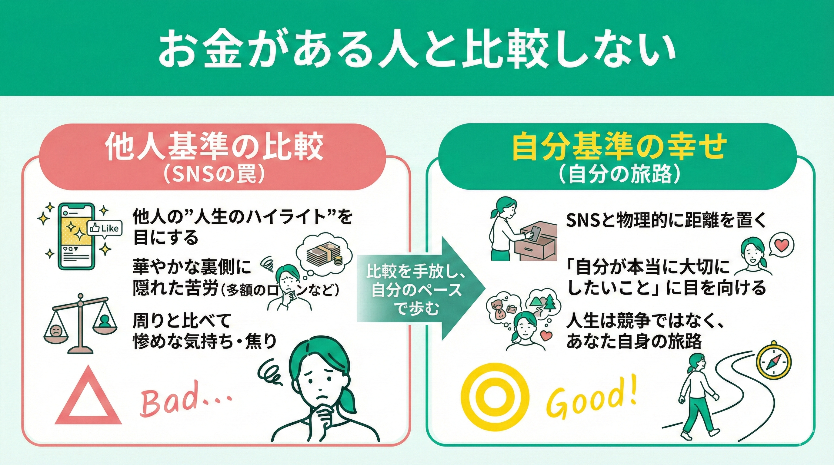 他人基準の幸せではなく「自分が本当に大切にしたいこと」に目を向けるだけで、焦りは驚くほど消えていきますよ。